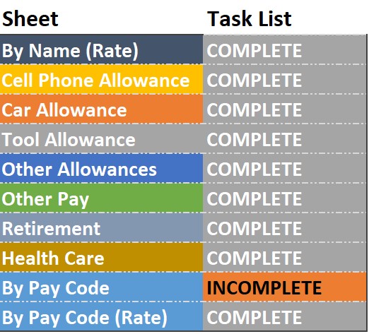 The Review Payroll task page is an organized list of tasks with a view to which have been completed, and which tasks require attention.